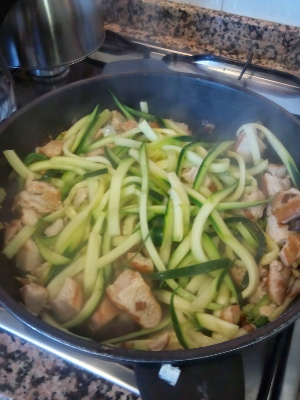 4) Tras cortar los lomos de pavo en trozos añadimos las tiras de calabacín a la sartén. Damos varias vueltas y finalmente añadimos la salsa de soja kikoman.
