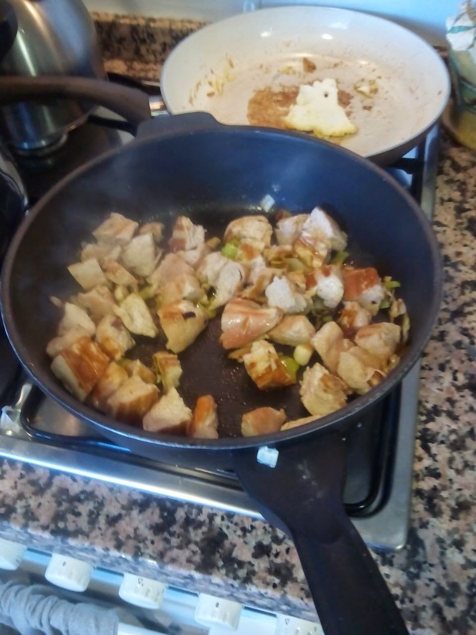 2) En una sartén ponemos unos ajitos con aceite (calcular el que le toca a cada uno según su dieta) y doramos unos lomos de pechuga de pavo (cuya cantidad también irá en función de cada dieta).