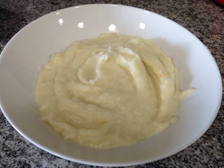 - Una vez cocinado cortarlo en rodajas finitas y añadirle el falso puré de patatas.