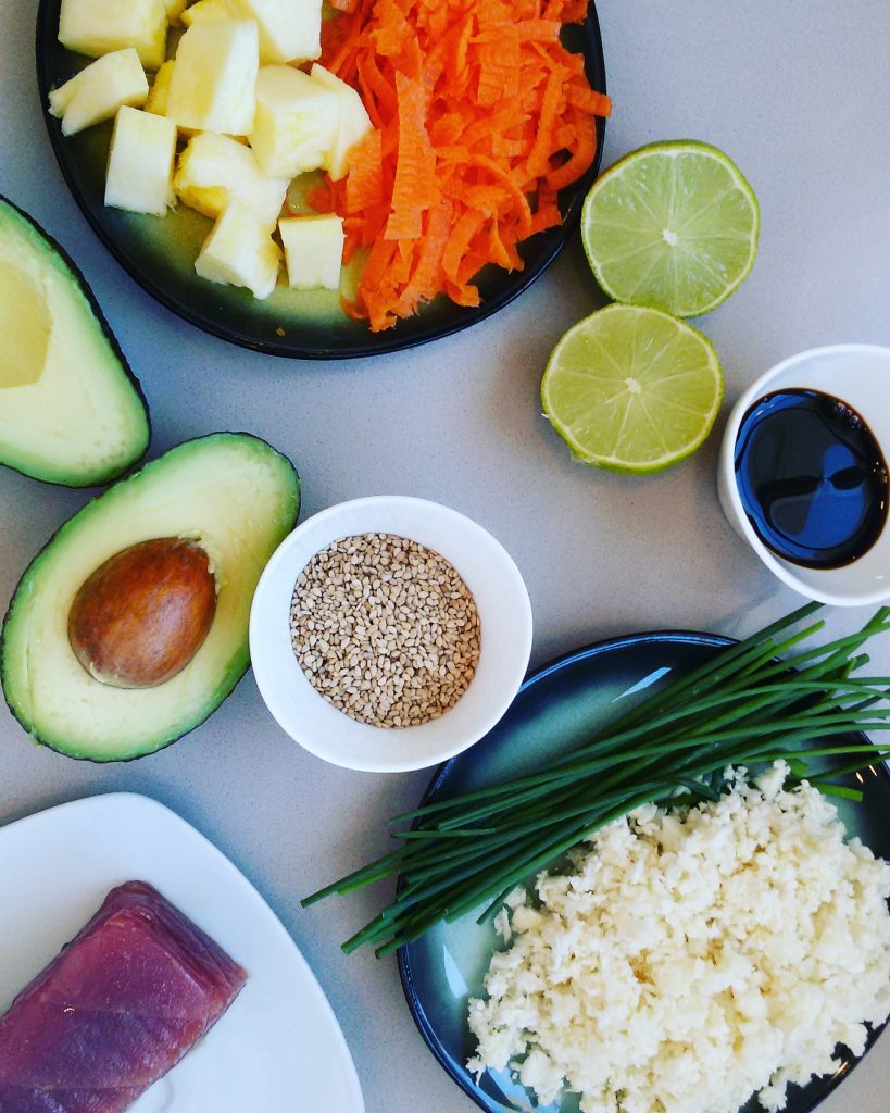 Es una combinación de tres elementos variables. En la base, arroz blanco (nuestra versión lleva “arroz” de coliflor, o si estás en la fase de legumbres puedes probar con quinoa). A continuación, pescado crudo como el atún, el bonito o el salmón, marinados en aliños con salsa de soja. Y por último, posibles ingredientes donde vale casi todo: algas, aguacate, pepino, huevas de pescado, sésamo, cebolleta, guindilla, verduras frescas, verduras encurtidas.. Cuanto más color, ¡mejor!