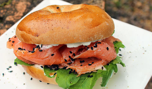 Tiempo de preparación: 20 minutos. Ingredientes para 2 personas: 2 panes tipo Bagel elaborados por nosotros 2 lonchas de salmón ahumado 2 hojas de lechuga u hoja de roble 1 cucharadita de mostaza Eneldo Pepinillos o alcaparras Queso de untar Philadelphia Light Para el...